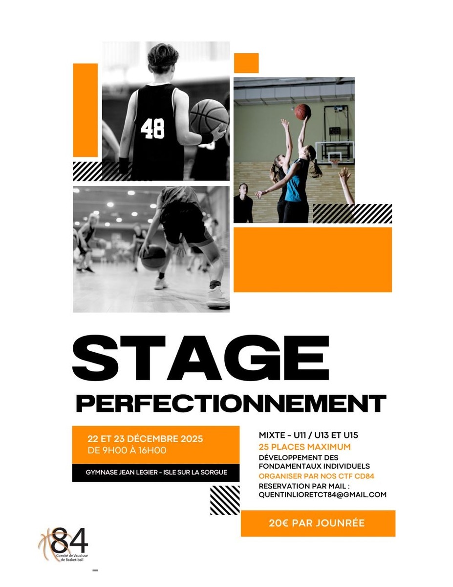 Le Comité de Basketball du Vaucluse (CD84) organise un stage de perfectionnement les 22 et 23 décembre au gymnase Jean Légier de L’Isle-sur-la-Sorgue.